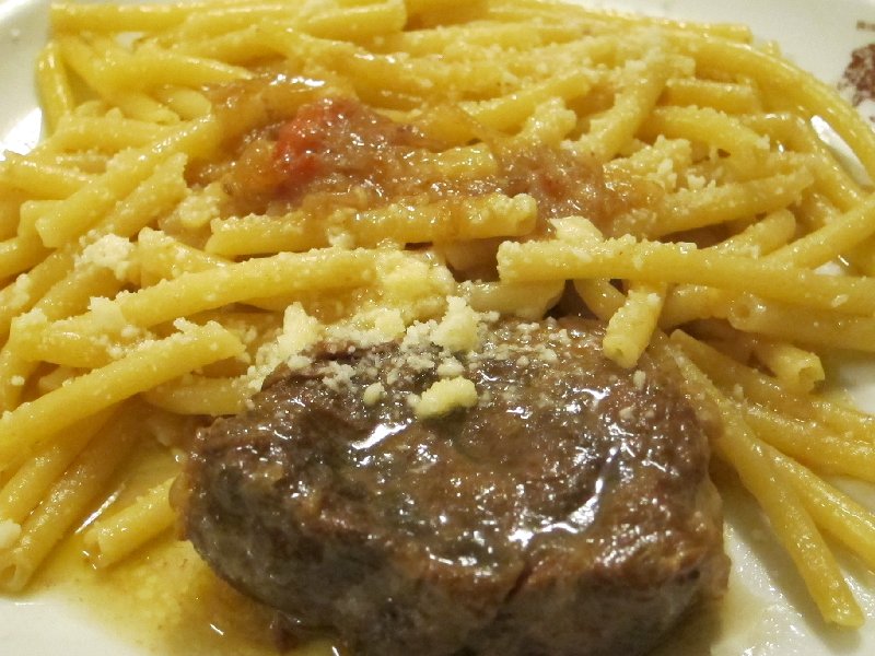 .Based on our experience the first night we decided to have our final lunch at Leon d'Oro Restaurant. Tonino was clearly pleased to see us again. We had a chard and bean soup and pasta genovese. Genovese is a slow cooked ragu', frequently made from pork. It's cooked for hours with olive oil, tomatoes and lots of onions and then served with a short-cut bucatini. Often the meat is broken up into pieces or, as in this case, served as one piece.